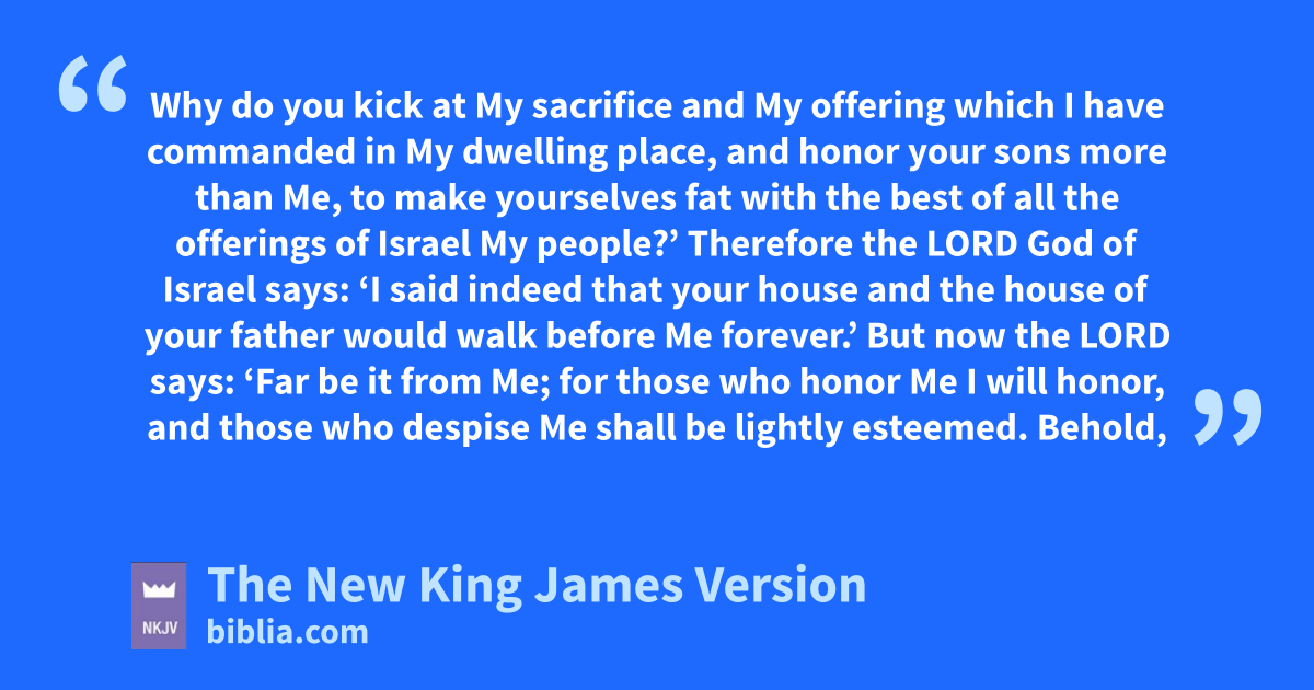 27 Then a tman of God came to Eli and said to him, “Thus says the Lord: u‘Did I not clearly reveal Myself to the house of your father when they were in Egypt in Pharaoh’s house? 28 Did I not vchoose him out of all the tribes of Israel to be My priest, to offer upon My altar, to burn incense, and to wear an ephod before Me? And wdid I not give to the house of your father all the offerings of the children of Israel made by fire? 29 Why do you xkick at My sacrifice and My offering which I have commanded in My ydwelling place, and honor your sons more than zMe, to make yourselves fat with the best of all the offerings of Israel My people?’ 30 Therefore the Lord God of Israel says: a‘I said indeed that your house and the house of your father would walk before Me forever.’ But now the Lord says: b‘Far be it from Me; for those who honor Me I will honor, and cthose who despise Me shall be lightly esteemed. 31 Behold, dthe days are coming that I will cut off your 2arm and the arm of your father’s house, so that there will not be an old man in your house. 32 And you will see an enemy in My dwelling place, despite all the good which God does for Israel. And there shall not be ean old man in your house forever. 33 But any of your men whom I do not cut off from My altar shall consume your eyes and grieve your heart. And all the descendants of your house shall die in the flower of their age. 34 Now this shall be fa sign to you that will come upon your two sons, on Hophni and Phinehas: gin one day they shall die, both of them. 35 Then hI will raise up for Myself a faithful priest who shall do according to what is in My heart and in My mind. iI will build him a sure house, and he shall walk before jMy anointed forever. 36 kAnd it shall come to pass that everyone who is left in your house will come and bow down to him for a piece of silver and a morsel of bread, and say, “Please, 3put me in one of the priestly positions, that I may eat a piece of bread.” ’ ”