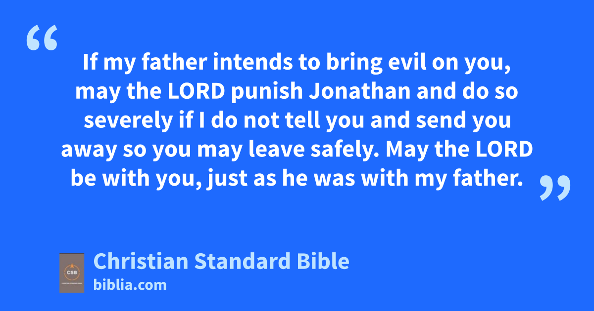 11 He answered David, “Come on, let’s go out to the countryside.” So both of them went out to the countryside. 12 “By the Lord, the God of Israel, I will sound out my father by this time tomorrow or the next day. If I find out that he is favorable toward you, will I not send for you and tell you? 13 If my father intends to bring evil on you, may the Lord punish Jonathan and do so severelya if I do not tell you and send you away so you may leave safely. May the Lord be with you,b just as he was with my father. 14 If I continue to live, show me kindness* from the Lord, but if I die, 15 don’t ever withdraw your kindness from my household—not even when the Lord cuts off every one of David’s enemies from the face of the earth.”c 16 Then Jonathan made a covenant with the house of David,d saying, “May the Lord hold David’s enemies accountable.”D,e 17 Jonathan once again swore to DavidE in his love for him, because he loved him as he loved himself.f