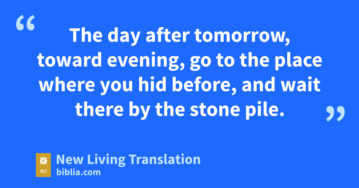 18 Then Jonathan said, “Tomorrow we celebrate the new moon festival. You will be missed when your place at the table is empty. 19 The day after tomorrow, toward evening, go to the place where you hid before, and wait there by the stone pile.* 20 I will come out and shoot three arrows to the side of the stone pile as though I were shooting at a target. 21 Then I will send a boy to bring the arrows back. If you hear me tell him, ‘They’re on this side,’ then you will know, as surely as the Lord lives, that all is well, and there is no trouble. 22 But if I tell him, ‘Go farther—the arrows are still ahead of you,’ then it will mean that you must leave immediately, for the Lord is sending you away. 23 And may the Lord make us keep our promises to each other, for he has witnessed them.”