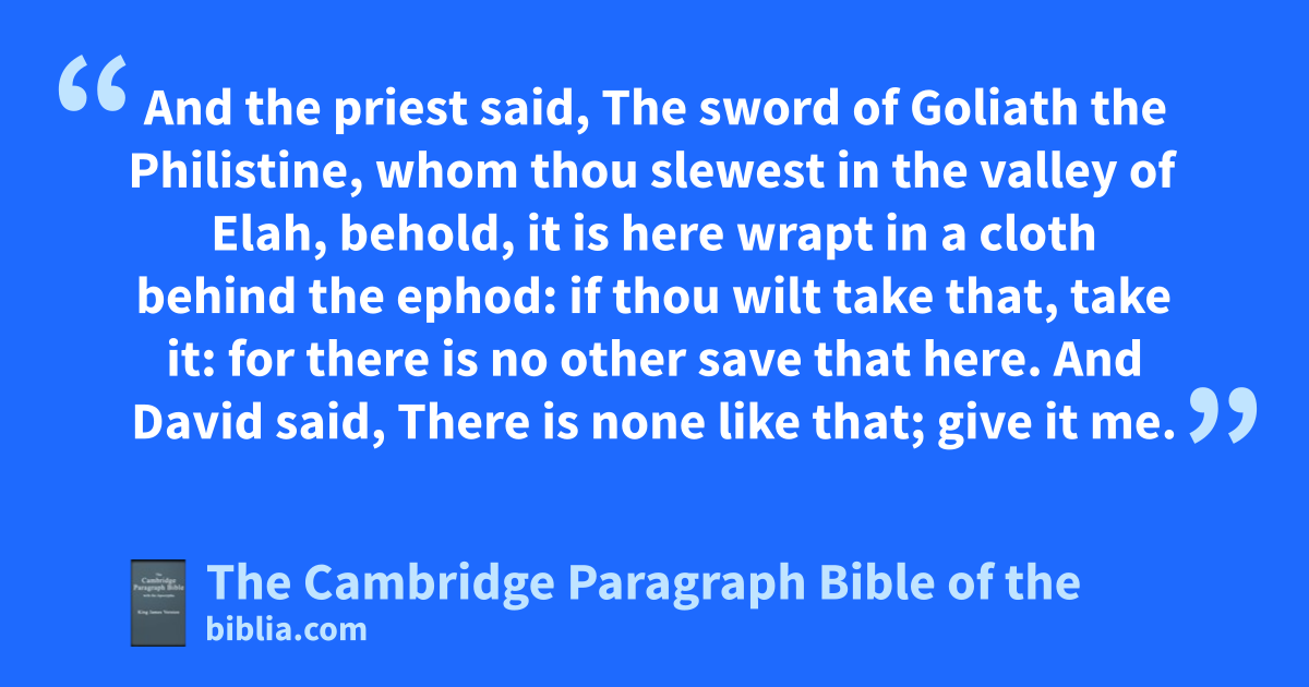 XXI. Then came David to aNob to * Ahimelech the priest: and Ahimelech was bafraid at the meeting of David, and said unto him, Why art thou alone, and no man with thee? 2 And David said unto Ahimelech the priest, The king hath commanded me a business, and hath said unto me, Let no man know any thing of the business whereabout I send thee, and what I have commanded thee: and I have appointed my servants to such and such a place. 3 Now therefore what is under thine hand? give me five loaves of bread in mine hand, or what there is * present. 4 And the priest answered David, and said, There is no common bread under mine hand, but there is challowed bread; dif the young men have kept themselves at least from women. 5 And David answered the priest, and said unto him, Of a truth women have been kept from us about these three days, since I came out, and the vessels of the young men are holy, and the bread is ein a manner common, * yea, though it were sanctified this day in the vessel. 6 So the priest gave him hallowed bread: for there was no bread there but the shewbread, fthat was taken from before the Lord, to put hot bread in the day when it was taken away. 7 Now a certain man of the servants of Saul was there that day, gdetained before the Lord; and his name was hDoeg, an Edomite, the chiefest of the herdmen that belonged to Saul. 8 And David said unto Ahimelech, And is there not here under thine hand spear or sword? for I have neither brought my sword nor my weapons with me, because the king’s business required haste. 9 And the priest said, iThe sword of Goliath the Philistine, whom thou slewest in kthe valley of Elah, lbehold, it is here wrapt in a cloth behind the ephod: if thou wilt take that, take it: for there is no other save that here. And David said, There is none like that; give it me.