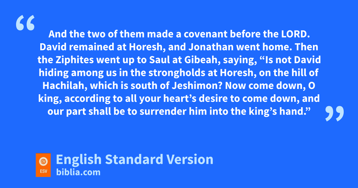 15 David saw that Saul had come out to seek his life. David was in the wilderness of Ziph at Horesh. 16 And Jonathan, Saul’s son, rose and went to David at Horesh, and strengthened his hand in God. 17 And he said to him, “Do not fear, for the hand of Saul my father shall not find you. You shall be king over Israel, and I shall be next to you. oSaul my father also knows this.” 18 pAnd the two of them made a covenant before the Lord. David remained at Horesh, and Jonathan went home.