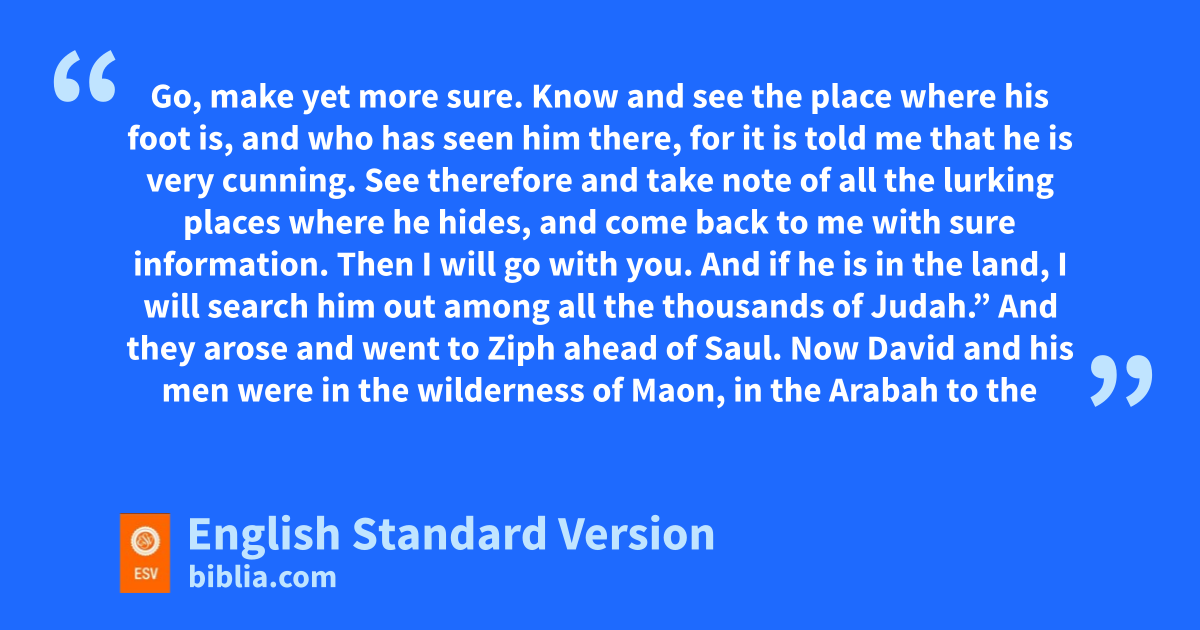 19 qThen the Ziphites went up to Saul at Gibeah, saying, “Is not David hiding among us in the strongholds at Horesh, on the hill of Hachilah, which is south of rJeshimon? 20 Now come down, O king, according to all your heart’s desire to come down, sand our part shall be to surrender him into the king’s hand.” 21 And Saul said, t“May you be blessed by the Lord, ufor you have had compassion on me. 22 Go, make yet more sure. Know and see the place where his foot is, and who has seen him there, for it is told me that he is very cunning. 23 See therefore and take note of all the lurking places where he hides, and come back to me with sure information. Then I will go with you. And if he is in the land, I will search him out among all the thousands of Judah.” 24 And they arose and went to Ziph ahead of Saul.