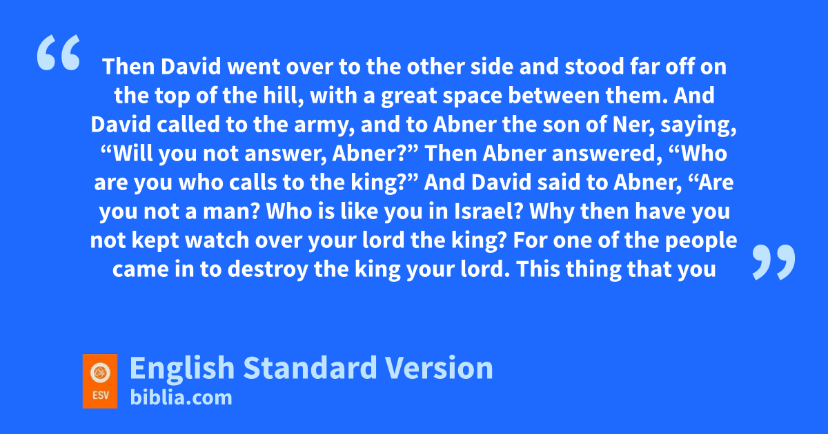 13 Then David went over to the other side and stood far off on the top of the hill, with a great space between them. 14 And David called to the army, and to Abner the son of Ner, saying, “Will you not answer, Abner?” Then Abner answered, “Who are you who calls to the king?” 15 And David said to Abner, “Are you not a man? Who is like you in Israel? Why then have you not kept watch over your lord the king? For one of the people came in to destroy the king your lord. 16 This thing that you have done is not good. kAs the Lord lives, you deserve to die, because you have not kept watch over your lord, the Lord’s anointed. And now see where the king’s spear is and the jar of water that was lat his head.”