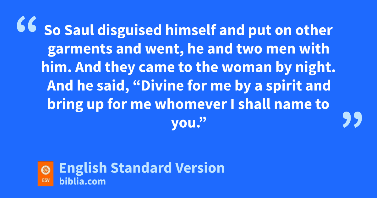 8 So Saul tdisguised himself and put on other garments and went, he and two men with him. And they came to the woman by night. And he said, u“Divine for me by a spirit and bring up for me whomever I shall name to you.” 9 The woman said to him, “Surely you know what Saul has done, lhow he has cut off the mediums and the necromancers from the land. Why then are you laying a trap for my life to bring about my death?” 10 But Saul swore to her by the Lord, v“As the Lord lives, no punishment shall come upon you for this thing.” 11 Then the woman said, “Whom shall I bring up for you?” He said, “Bring up Samuel for me.” 12 When the woman saw Samuel, she cried out with a loud voice. And the woman said to Saul, “Why have you deceived me? You are Saul.” 13 The king said to her, “Do not be afraid. What do you see?” And the woman said to Saul, “I see a god coming up out of the earth.” 14 He said to her, “What is his appearance?” And she said, “An old man is coming up, and he is wrapped win a robe.” And Saul knew that it was Samuel, and he bowed with his face to the ground and paid homage.