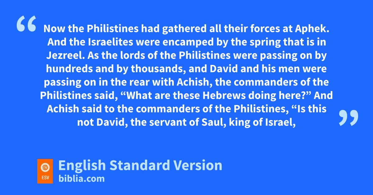 29 dNow the Philistines had gathered all their forces at eAphek. And the Israelites were encamped by fthe spring that is in gJezreel. 2 As hthe lords of the Philistines were passing on by hundreds and by thousands, and David and his men were passing on in the rear iwith Achish, 3 the commanders of the Philistines said, “What are these Hebrews doing here?” And Achish said to the commanders of the Philistines, “Is this not David, the servant of Saul, king of Israel, who has been with me jnow for days and years, and since he deserted to me kI have found no fault in him to this day.” 4 But hthe commanders of the Philistines were angry with him. And the commanders of the Philistines said to him, “Send the man back, that he may return lto the place to which you have assigned him. He shall not go down with us to battle, mlest in the battle he become an adversary to us. For how could this fellow reconcile himself to his lord? Would it not be with the heads of the men here? 5 Is not this David, of whom they sing to one another in dances,