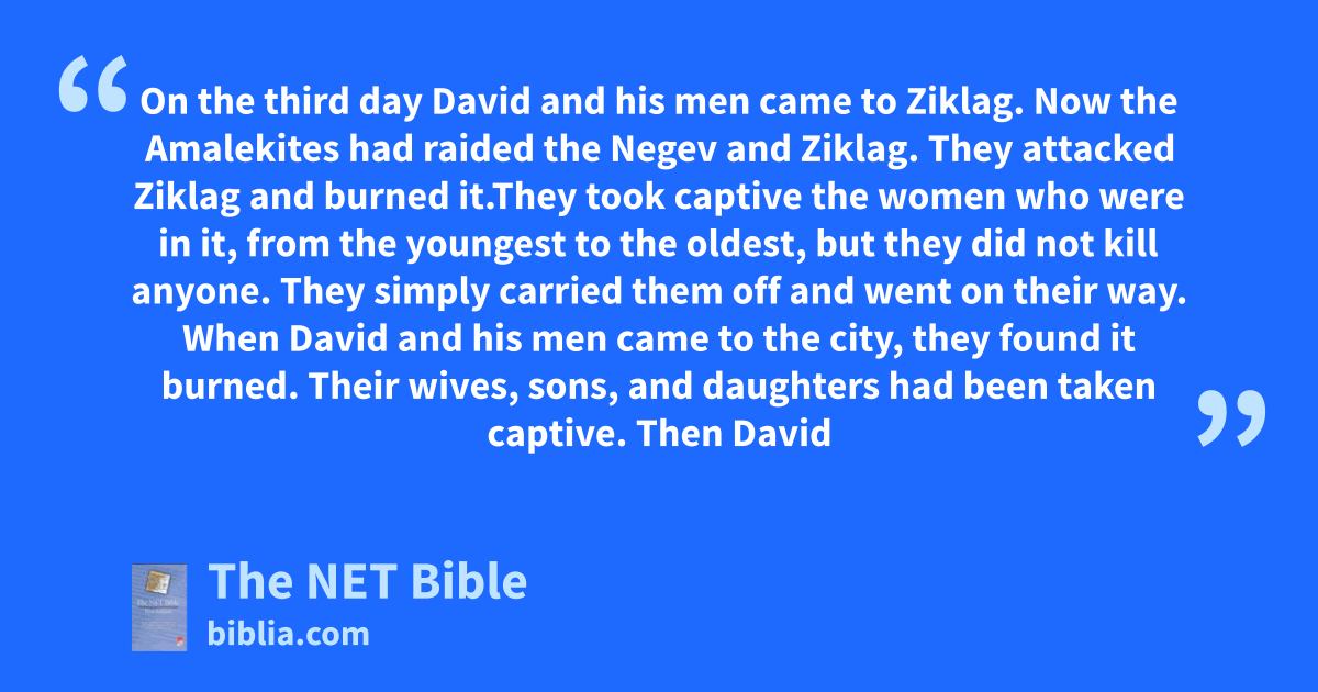 30:1 On the third day David and his men came to Ziklag. Now the Amalekites had raided the Negev and Ziklag. They attacked Ziklag and burned it.1 30:2 They took captive the women who were in it, from the youngest to the oldest, but they did not kill anyone. They simply carried them off and went on their way.