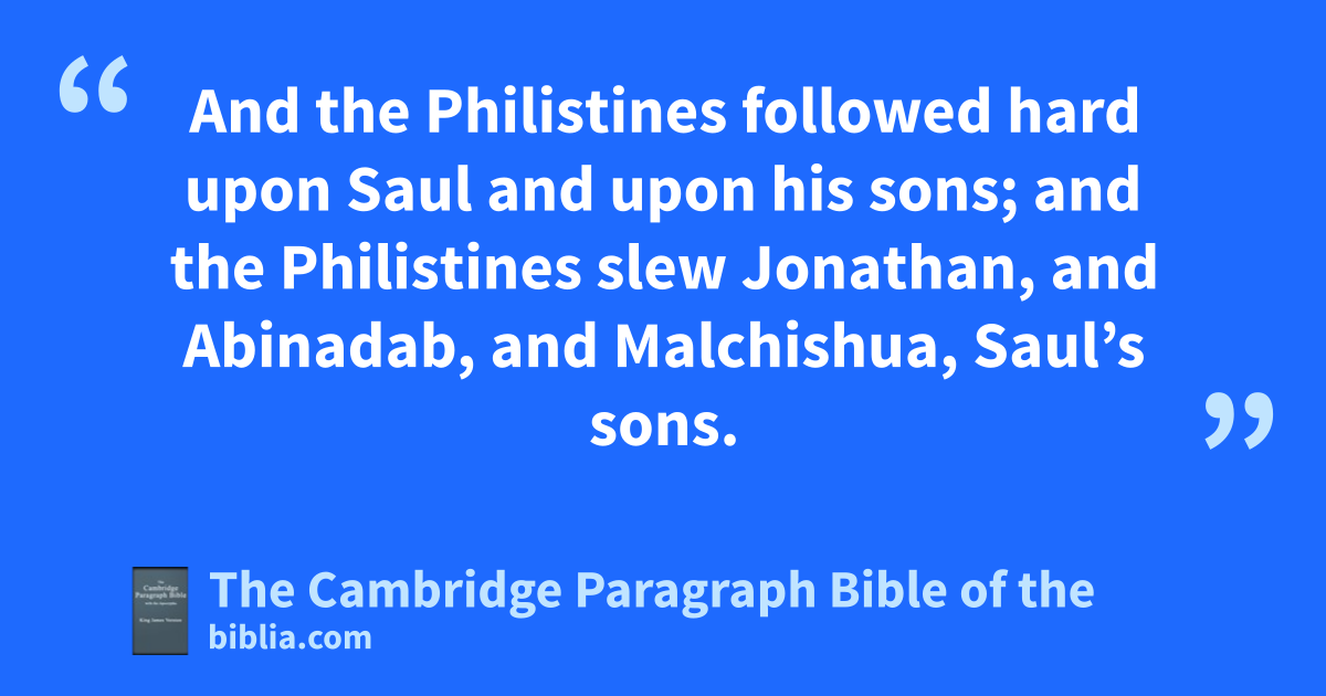 XXXI. Now athe Philistines fought against Israel: and the men of Israel fled from before the Philistines, and fell down * slain in mount bGilboa. 2 And the Philistines followed hard upon Saul and upon his sons; and the Philistines slew cJonathan, and Abinadab, and Malchishua, Saul’s sons. 3 And dthe battle went sore against Saul, and the * archers * hit him; and he was sore wounded of the archers. 4 eThen said Saul unto his armourbearer, Draw thy sword, and thrust me through therewith; lest fthese uncircumcised come and thrust me through, and * abuse me. But his armourbearer would not; gfor he was sore afraid: therefore Saul took a sword, and hfell upon it. 5 And when his armourbearer saw that Saul was dead, he fell likewise upon his sword, and died with him. 6 So Saul died, and his three sons, and his armourbearer, and all ihis men, that same day together.
