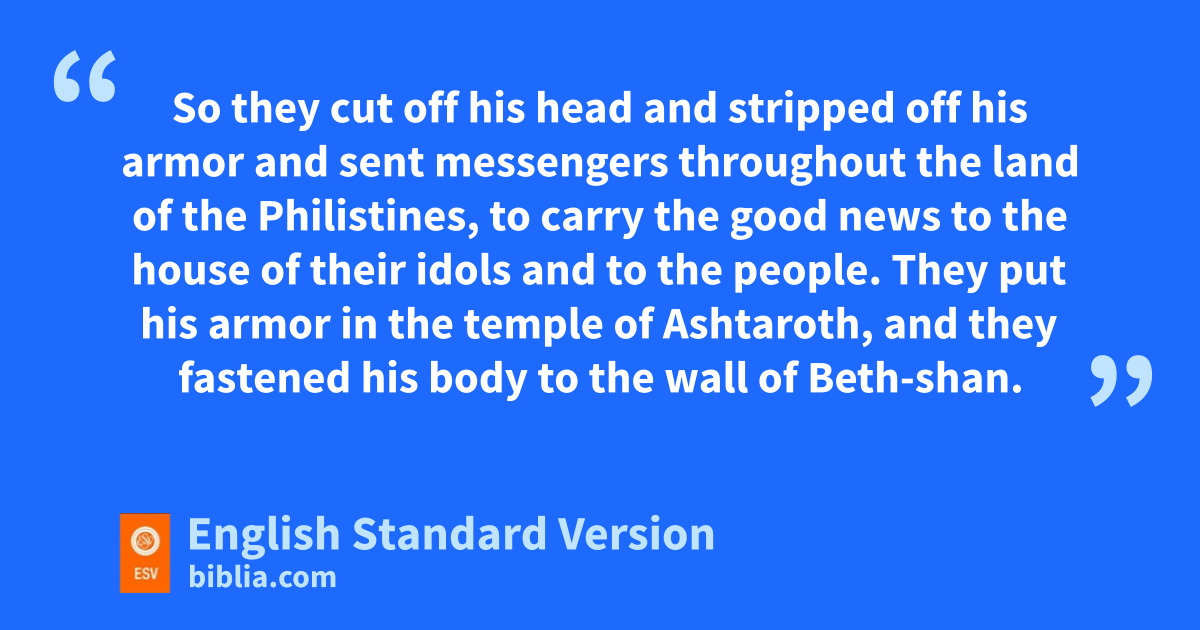 8 The next day, when the Philistines came to strip the slain, they found Saul and his three sons fallen on Mount Gilboa. 9 So they cut off his head and stripped off his armor and sent messengers throughout the land of the Philistines, dto carry the good news eto the house of their idols and to the people. 10 fThey put his armor in the temple of gAshtaroth, and they fastened his body to the wall of hBeth-shan. 11 iBut when the inhabitants of Jabesh-gilead heard what the Philistines had done to Saul, 12 jall the valiant men arose and went all night and took the body of Saul and the bodies of his sons from the wall of Beth-shan, and they came to Jabesh kand burned them there. 13 And they took their bones land buried them under mthe tamarisk tree in Jabesh and nfasted seven days.