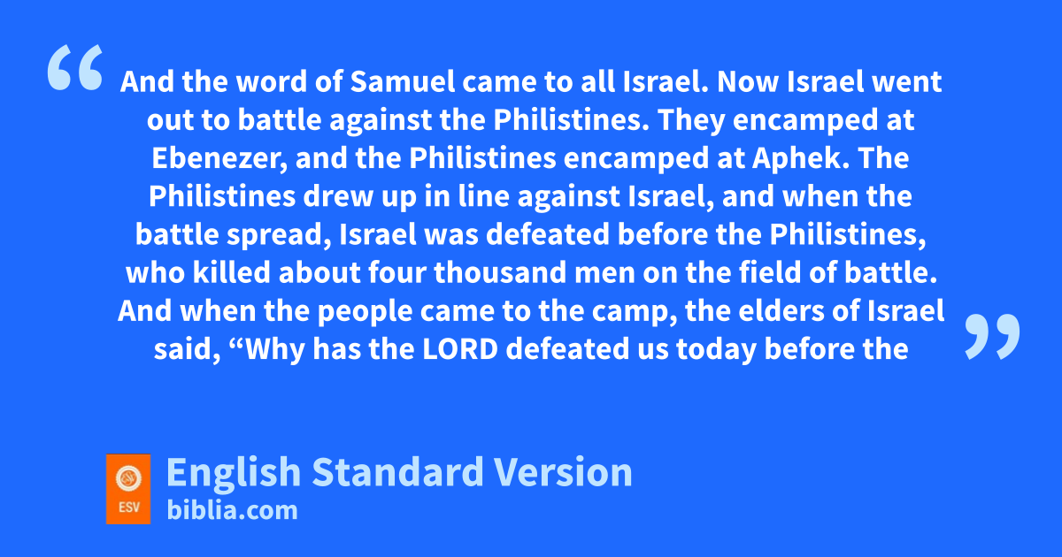 Now Israel went out to battle against the Philistines. They encamped at wEbenezer, and the Philistines encamped at xAphek. 2 The Philistines drew up in line against Israel, and when the battle spread, Israel was defeated before the Philistines, who killed about four thousand men on the field of battle. 3 And when the people came to the camp, the elders of Israel said, “Why has the Lord defeated us today before the Philistines? Let us bring the ark of the covenant of the Lord here yfrom Shiloh, that it1 may come among us and save us from the power of our enemies.” 4 So the people sent to Shiloh and brought from there the ark of the covenant of the Lord of hosts, zwho is enthroned on the cherubim. And the two sons of Eli, Hophni and Phinehas, were there with the ark of the covenant of God.