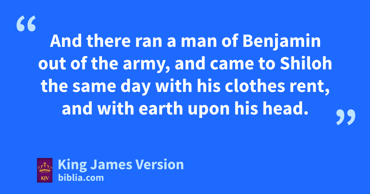12 And there ran a man of Benjamin out of the army, and came to dShiloh the same day nwith his clothes rent, and owith earth upon his head. 13 And when he came, lo, Eli sat pupon a seat by the wayside watching: for his heart trembled for the ark of God. And when the man came into the city, and told it, all the city cried out. 14 And when Eli heard the noise of the crying, he said, What meaneth the noise of this tumult? And the man came in hastily, and told Eli. 15 Now Eli was ninety and eight years old; and qhis eyes †were dim, that he could not see. 16 And the man said unto Eli, I am he that came out of the army, and I fled to day out of the army. And he said, What †is there done, my son? 17 And the messenger answered and said, Israel is fled before the Philistines, and there hath been also a great slaughter among the people, and thy two sons also, Hophni and Phinehas, are dead, and the ark of God is taken. 18 *And it came to pass, when he made mention of the ark of God, that he fell from off the seat backward by the side of the gate, and his neck brake, and he died: for he was an old man, and heavy. ||And he had judged Israel forty years.