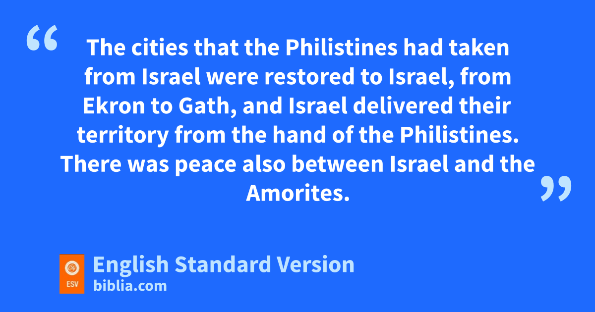 12 Then Samuel mtook a stone and set it up between Mizpah and Shen1 and called its name Ebenezer;2 for he said, “Till now the Lord has helped us.” 13 nSo the Philistines were subdued and did not again enter the territory of Israel. And the hand of the Lord was against the Philistines all the days of Samuel. 14 The cities that the Philistines had taken from Israel were restored to Israel, from Ekron to Gath, and Israel delivered their territory from the hand of the Philistines. There was peace also between Israel and the Amorites.