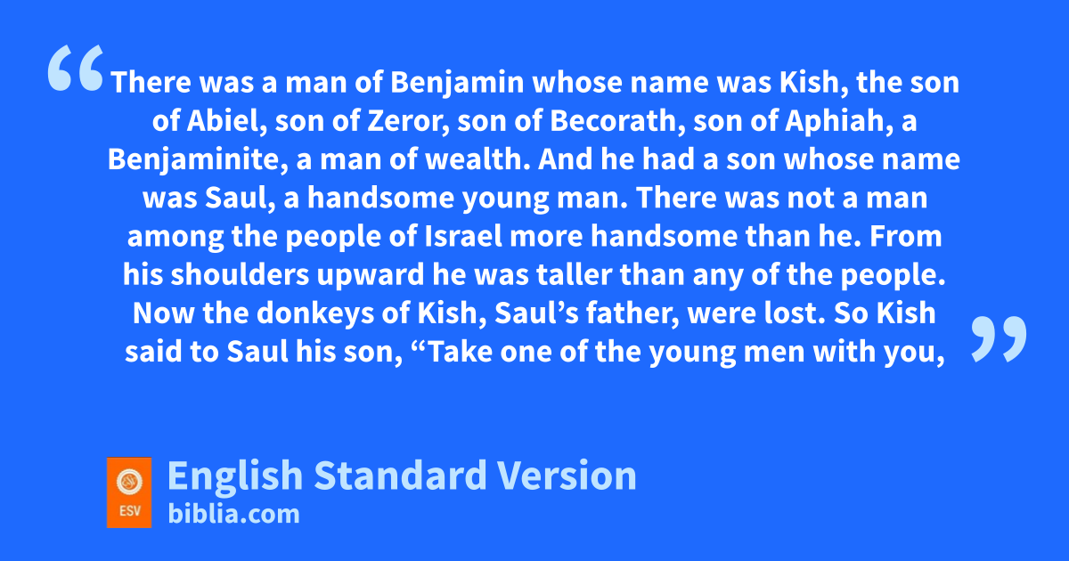 9 There was a man of Benjamin whose name was fKish, the son of Abiel, son of Zeror, son of Becorath, son of Aphiah, a Benjaminite, a man of wealth. 2 And he had a son whose name was Saul, ga handsome young man. There was not a man among the people of Israel more handsome than he. hFrom his shoulders upward he was taller than any of the people.