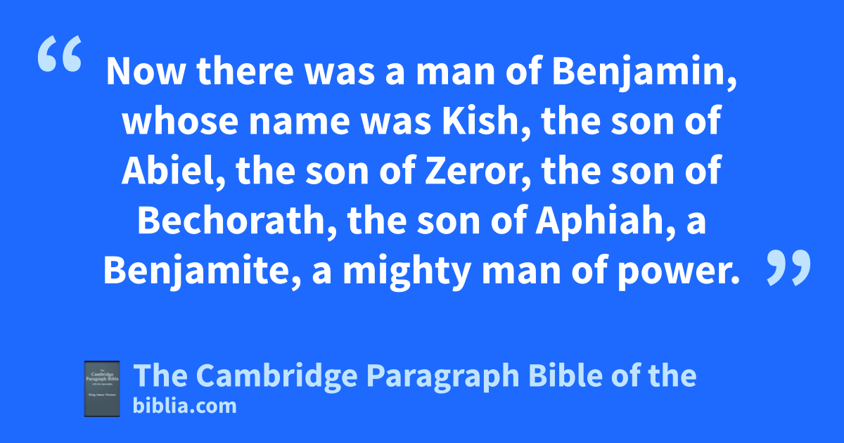 IX. Now there was a man of Benjamin, whose name was aKish, the son of Abiel, the son of Zeror, the son of Bechorath, the son of Aphiah, * a Benjamite, a mighty man of * power. 2 And he had a son, whose name was Saul, ba choice young man, and a goodly: and there was not among the children of Israel a goodlier person than he: cfrom his shoulders and upward he was higher than any of the people. 3 And the asses of Kish Saul’s father were lost. And Kish said to Saul his son, Take now one of the servants with thee, and arise, go seek the asses. 4 And he passed through dmount Ephraim, and passed through the land of eShalisha, but they found them not: then they passed through the land of fShalim, and there they were not: and he passed through the land of the Benjamites, but they found them not. 5 And when they were come to the land of gZuph, Saul said to his servant that was with him, Come, and let us return; lest my father leave caring for the asses, and htake thought for us. 6 And he said unto him, Behold now, there is in this city ia man of God, and he is an honourable man; jall that he saith cometh surely to pass: now let us go thither; peradventure he can shew us our way that we should go. 7 Then said Saul to his servant, But behold, if we go, kwhat shall we bring the man? for the bread * is spent in our vessels, and there is not a present to bring to ithe man of God: what * have we? 8 And the servant answered Saul again, and said, Behold, * I have here at hand the fourth part of a shekel of silver: that will I give to the man of God, to tell us our way. 9 (Beforetime in Israel, when a man lwent to inquire of God, thus he spake, Come, and let us go to the seer: for he that is now called a Prophet was beforetime called ma Seer.) 10 Then said Saul to his servant, * Well said; come, let us go. So they went unto the city where the man of God was. 11 And as they went up * the hill to the city, they found nyoung maidens going out to draw water, and said unto them, Is the seer here? 12 And they answered them, and said, He is; behold, he is before you: make haste now, for he came to day to the city; for there is a * sacrifice of the people to day in othe high place: 13 as soon as ye be come into the city, ye shall straightway find him, before he go up to othe high place to eat: for the people will not eat until he come, because he doth bless the sacrifice; and afterwards they eat that be bidden. Now therefore get you up; for about * this time ye shall find him. 14 And they went up into the city: and when they were come into the city, behold, Samuel came out against them, for to go up to the high place.