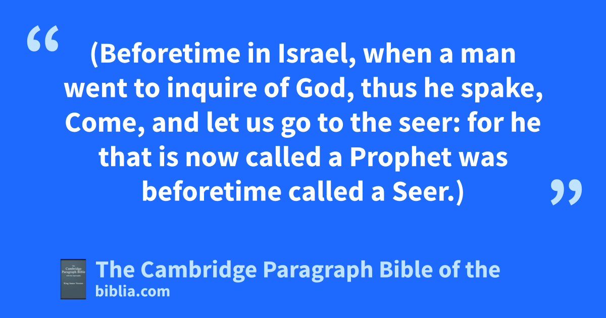 IX. Now there was a man of Benjamin, whose name was aKish, the son of Abiel, the son of Zeror, the son of Bechorath, the son of Aphiah, * a Benjamite, a mighty man of * power. 2 And he had a son, whose name was Saul, ba choice young man, and a goodly: and there was not among the children of Israel a goodlier person than he: cfrom his shoulders and upward he was higher than any of the people. 3 And the asses of Kish Saul’s father were lost. And Kish said to Saul his son, Take now one of the servants with thee, and arise, go seek the asses. 4 And he passed through dmount Ephraim, and passed through the land of eShalisha, but they found them not: then they passed through the land of fShalim, and there they were not: and he passed through the land of the Benjamites, but they found them not. 5 And when they were come to the land of gZuph, Saul said to his servant that was with him, Come, and let us return; lest my father leave caring for the asses, and htake thought for us. 6 And he said unto him, Behold now, there is in this city ia man of God, and he is an honourable man; jall that he saith cometh surely to pass: now let us go thither; peradventure he can shew us our way that we should go. 7 Then said Saul to his servant, But behold, if we go, kwhat shall we bring the man? for the bread * is spent in our vessels, and there is not a present to bring to ithe man of God: what * have we? 8 And the servant answered Saul again, and said, Behold, * I have here at hand the fourth part of a shekel of silver: that will I give to the man of God, to tell us our way. 9 (Beforetime in Israel, when a man lwent to inquire of God, thus he spake, Come, and let us go to the seer: for he that is now called a Prophet was beforetime called ma Seer.) 10 Then said Saul to his servant, * Well said; come, let us go. So they went unto the city where the man of God was. 11 And as they went up * the hill to the city, they found nyoung maidens going out to draw water, and said unto them, Is the seer here? 12 And they answered them, and said, He is; behold, he is before you: make haste now, for he came to day to the city; for there is a * sacrifice of the people to day in othe high place: 13 as soon as ye be come into the city, ye shall straightway find him, before he go up to othe high place to eat: for the people will not eat until he come, because he doth bless the sacrifice; and afterwards they eat that be bidden. Now therefore get you up; for about * this time ye shall find him. 14 And they went up into the city: and when they were come into the city, behold, Samuel came out against them, for to go up to the high place.