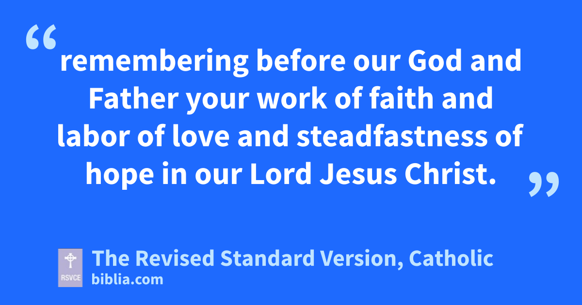2 We give thanks to God always for you all, constantly mentioning you in our prayers, 3 remembering before our God and Father your work of faith and labor of love and steadfastness of hope in our Lord Jesus Christ. 4 For we know, brethren beloved by God, that he has chosen you; 5 for our gospel came to you not only in word, but also in power and in the Holy Spirit and with full conviction. You know what kind of men we proved to be among you for your sake. 6 And you became imitators of us and of the Lord, for you received the word in much affliction, with joy inspired by the Holy Spirit; 7 so that you became an example to all the believers in Macedonia and in Achaia. 8 For not only has the word of the Lord sounded forth from you in Macedonia and Achaia, but your faith in God has gone forth everywhere, so that we need not say anything. 9 For they themselves report concerning us what a welcome we had among you, and how you turned to God from idols, to serve a living and true God, 10 and to wait for his Son from heaven, whom he raised from the dead, Jesus who delivers us from the wrath to come.