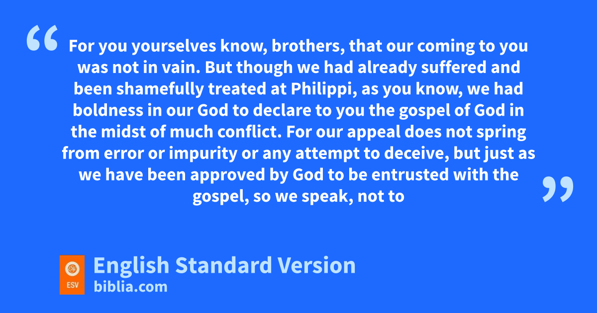 2 For you yourselves know, brothers,1 that our fcoming to you gwas not in vain. 2 But though we had already suffered and been shamefully treated hat Philippi, as you know, iwe had boldness in our God jto declare to you the gospel of God in the midst of much kconflict. 3 For lour appeal does not spring from merror or nimpurity or oany attempt to deceive, 4 but just as we have been approved by God pto be entrusted with the gospel, so we speak, not qto please man, but to please God rwho tests our hearts. 5 sFor we never came with words of flattery,2 as you know, nor with a pretext for greed—tGod is witness. 6 uNor did we seek glory from people, whether from you or from others, vthough we could have made wdemands as xapostles of Christ. 7 But we were ygentle3 among you, zlike a nursing mother taking care of her own children. 8 So, being affectionately desirous of you, we were ready to share with you not only the gospel of God abut also our own selves, because you had become very dear to us.