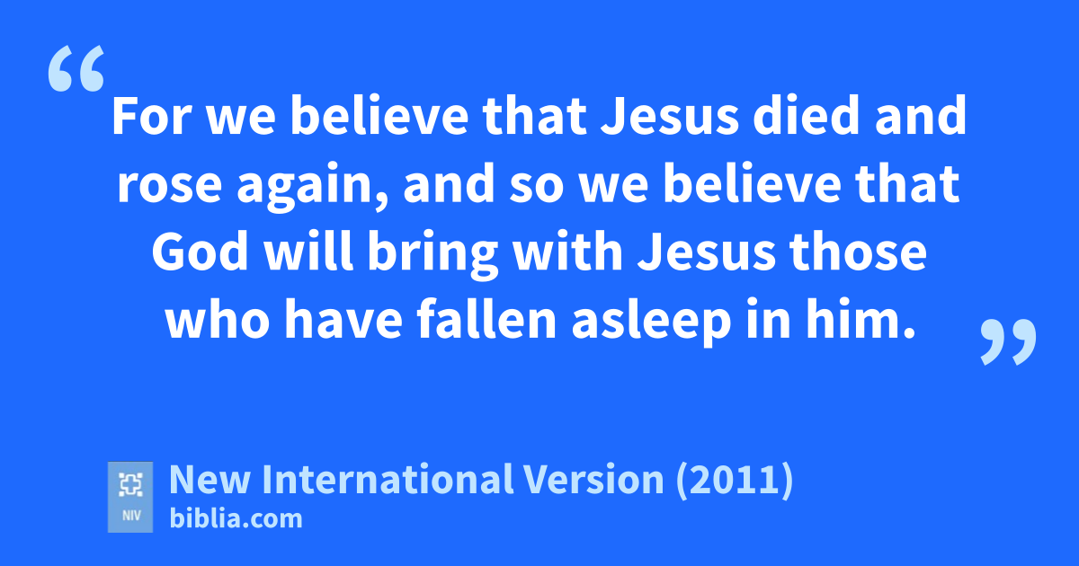 13 Brothers and sisters, we do not want you to be uninformedr about those who sleep in death,s so that you do not grieve like the rest of mankind, who have no hope.t 14 For we believe that Jesus died and rose again,u and so we believe that God will bring with Jesus those who have fallen asleep in him.v 15 According to the Lord’s word, we tell you that we who are still alive, who are left until the coming of the Lord,w will certainly not precede those who have fallen asleep.x 16 For the Lord himself will come down from heaven,y with a loud command, with the voice of the archangelz and with the trumpet call of God,a and the dead in Christ will rise first.b 17 After that, we who are still alive and are leftc will be caught up together with them in the cloudsd to meet the Lord in the air. And so we will be with the Lorde forever. 18 Therefore encourage one anotherf with these words.