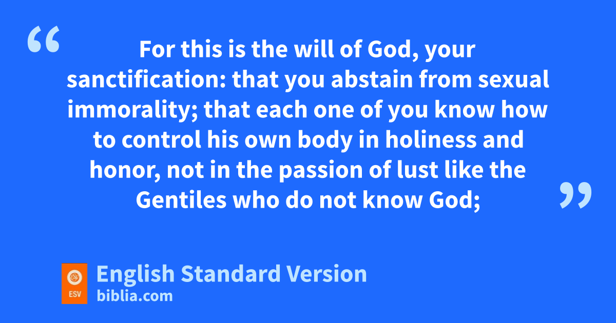4 Finally, then, brothers,1 we ask and urge you in the Lord Jesus, that as you dreceived from us ehow you ought to walk and fto please God, just as you are doing, that you gdo so more and more. 2 For hyou know what instructions we gave you through the Lord Jesus. 3 For this is the will of God, iyour sanctification:2 jthat you abstain from sexual immorality; 4 that each one of you know how to control his own kbody3 in holiness and lhonor, 5 not in mthe passion of lust nlike the Gentiles owho do not know God; 6 that no one transgress and pwrong his brother in this matter, because the Lord is qan avenger in all these things, as we told you beforehand and solemnly warned you. 7 For rGod has not called us for simpurity, but in holiness. 8 Therefore twhoever disregards this, disregards not man but God, uwho gives his Holy Spirit to you.