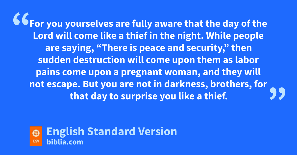 5 Now concerning wthe times and the seasons, brothers,1 xyou have no need to have anything written to you. 2 For you yourselves are fully aware that ythe day of the Lord will come like a thief in the night. 3 While people are saying, “There is peace and security,” then zsudden destruction will come upon them aas labor pains come upon a pregnant woman, and they will not escape. 4 But you bare not in darkness, brothers, for that day to surprise you like a thief. 5 For you are all cchildren2 of light, children of the day. We are not of the night or of the darkness. 6 So then dlet us not sleep, as others do, but let us ekeep awake and fbe sober. 7 For those who sleep, sleep at night, and those who get drunk, gare drunk at night. 8 But since we belong to the day, let us be sober, hhaving put on the breastplate of ifaith and love, and for a helmet the hope of salvation. 9 For God has not destined us for jwrath, but kto obtain salvation through our Lord Jesus Christ, 10 lwho died for us so that whether we are awake or asleep we might live with him. 11 Therefore encourage one another and build one another up, just as you are doing.