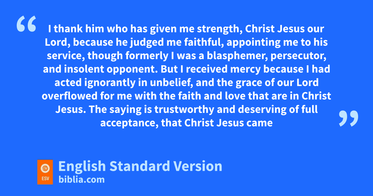 12 I thank him xwho has given me strength, Christ Jesus our Lord, because he judged me faithful, yappointing me to his service, 13 though formerly I was a blasphemer, zpersecutor, and insolent opponent. But aI received mercy bbecause I had acted ignorantly in unbelief, 14 and cthe grace of our Lord overflowed for me with the dfaith and love that are in Christ Jesus. 15 The saying is etrustworthy and deserving of full acceptance, that Christ Jesus fcame into the world to save sinners, gof whom I am the foremost. 16 But I received mercy for this reason, that in me, as the foremost, Jesus Christ might display his perfect patience as an example to those who were to believe in him for eternal life. 17 To hthe King of the ages, iimmortal, jinvisible, kthe only God, lbe honor and glory forever and ever.4 Amen.