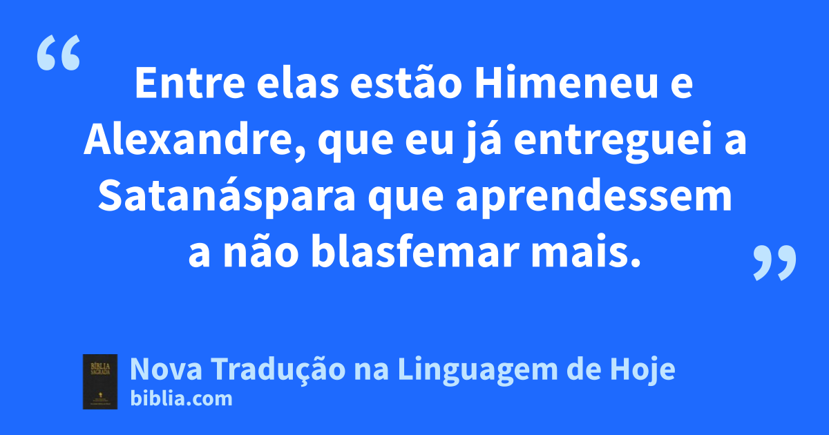 18 Timóteo, meu filho, eu entrego essa ordem a você. Ela está de acordo com as palavras da * profecia b , ditas há muito tempo a respeito de você. Que essas palavras sejam as suas armas para que você possa combater bem!19 Conserve a sua fé e mantenha a sua consciência limpa. Algumas pessoas não têm escutado a sua própria consciência, e isso tem causado a destruição da sua fé.20 Entre elas estão Himeneu e Alexandre, que eu já entreguei a Satanásc para que aprendessem a não * blasfemar mais.