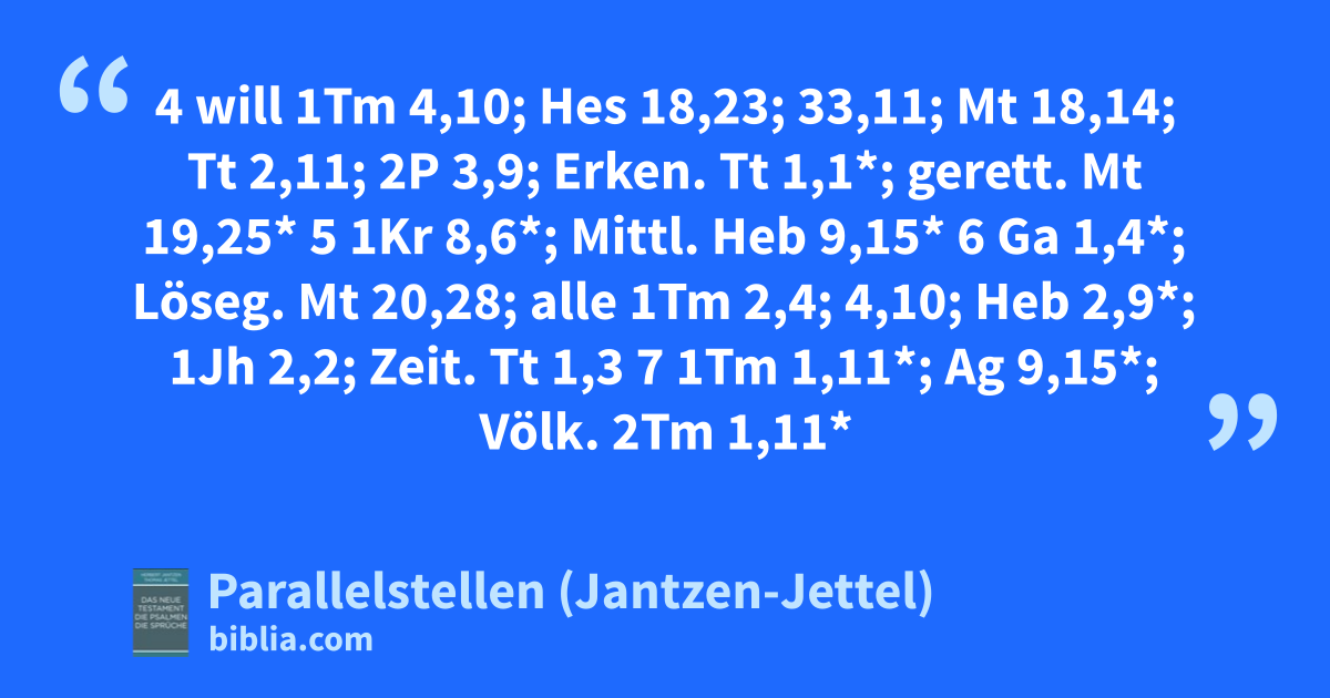 4 will 1Tm 4,10; Hes 18,23; 33,11; Mt 18,14; Tt 2,11; 2P 3,9; Erken. Tt 1,1*; gerett. Mt 19,25*