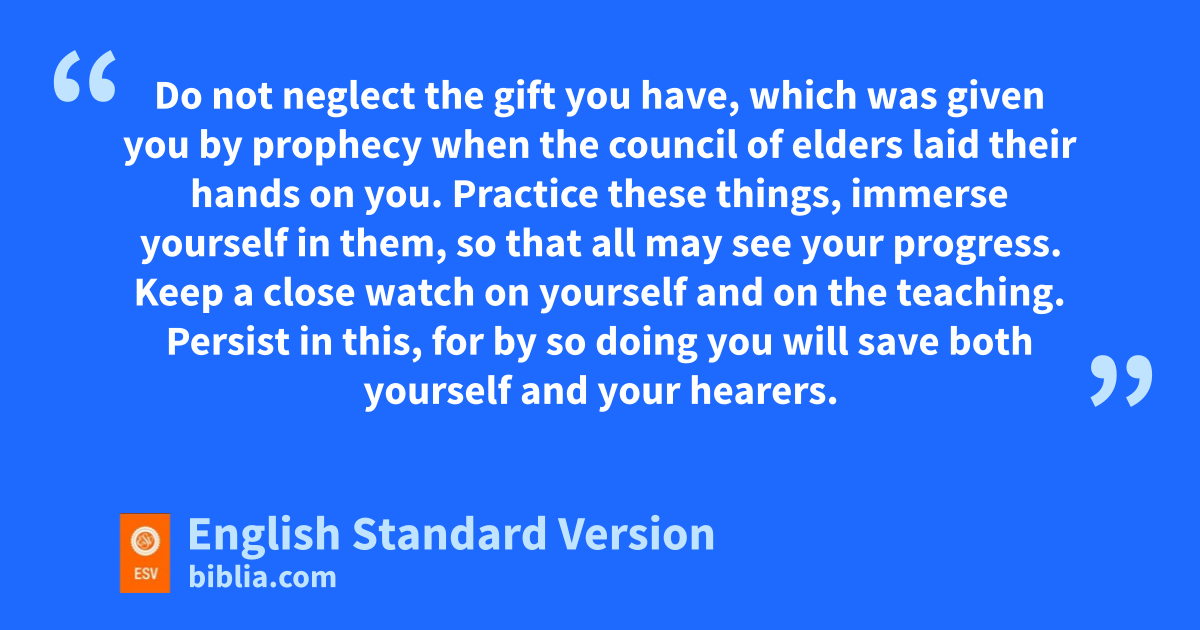 11 Command and teach rthese things. 12 sLet no one despise you for your youth, but set the believers tan example in speech, in conduct, in love, in faith, in purity. 13 Until I come, devote yourself to the public reading of Scripture, to exhortation, to teaching. 14 uDo not neglect the gift you have, which was given you vby prophecy when the council of elders wlaid their hands on you. 15 Practice these things, immerse yourself in them,3 so that xall may see your progress. 16 yKeep a close watch on yourself and on the teaching. Persist in this, for by so doing you will save zboth yourself and ayour hearers.