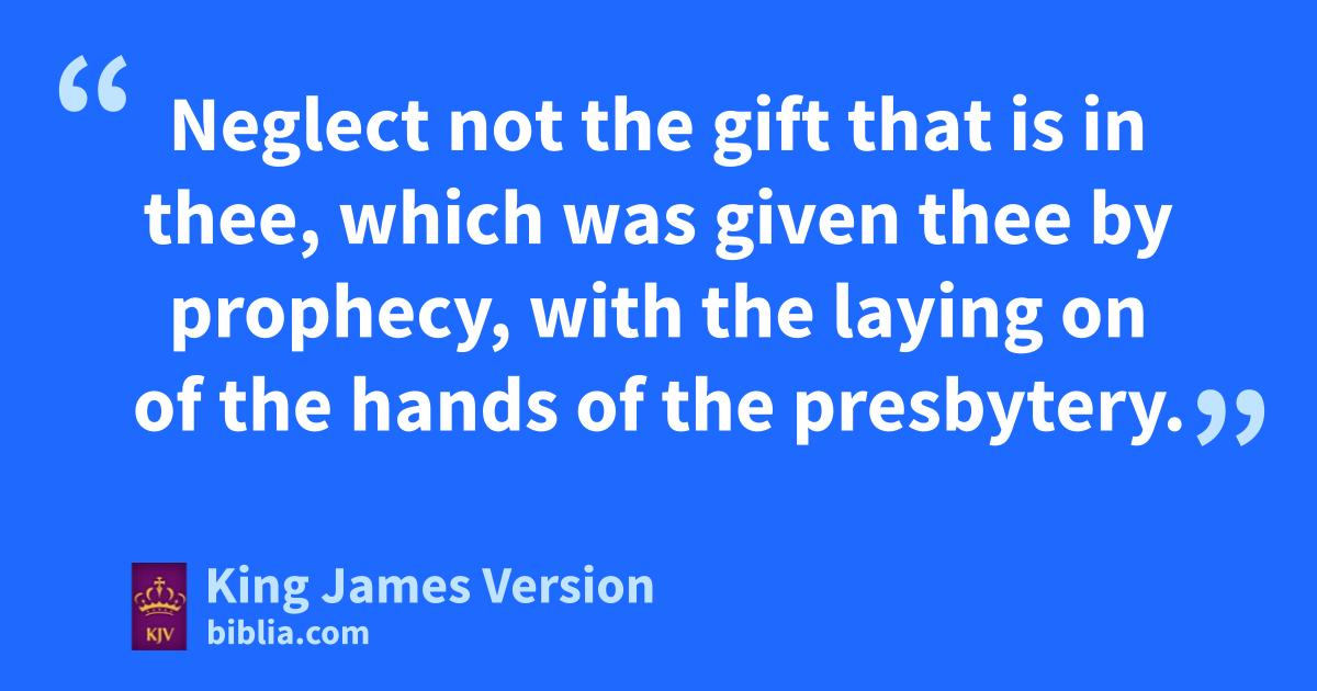12 fLet no man despise gthy youth; but hbe thou ian example of the believers, in word, in jconversation, in kcharity, in spirit, in kfaith, in lpurity. 13 Till I come, give attendance to reading, to mexhortation, to ndoctrine. 14 oNeglect not the gift that is in thee, which was given thee pby prophecy, qwith the laying on of rthe hands of the presbytery. 15 Meditate upon these things; give thyself wholly to them; that thy sprofiting may appear ||to all. 16 tTake heed unto thyself, and unto the ndoctrine; continue in them: for in doing this uthou shalt both save thyself, and xthem that hear thee.