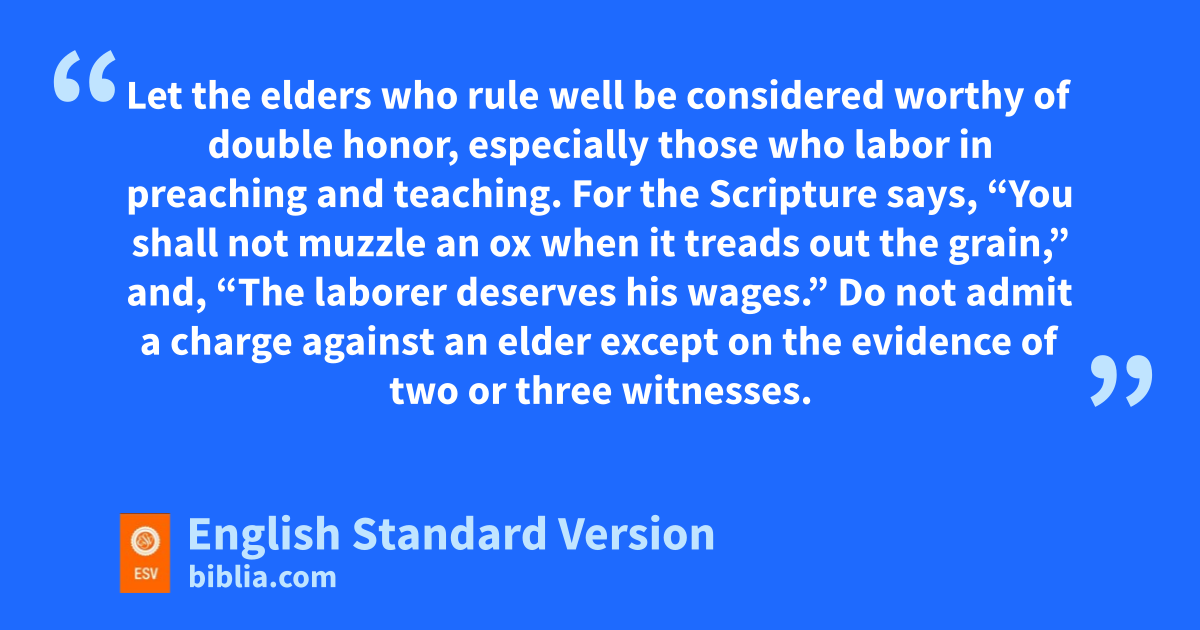 17 Let the elders zwho rule well be considered worthy of adouble honor, especially those who labor in preaching and teaching. 18 For the Scripture says, b“You shall not muzzle an ox when it treads out the grain,” and, c“The laborer deserves his wages.” 19 Do not admit a charge against an elder except don the evidence of two or three witnesses. 20 As for those who persist in sin, erebuke them in the presence of all, fso that the rest may stand in fear. 21 In the presence of God and of Christ Jesus and of the elect angels gI charge you to keep these rules without prejudging, hdoing nothing from partiality. 22 iDo not be hasty in the jlaying on of hands, nor ktake part in the sins of others; keep yourself pure. 23 (No longer drink only water, but luse a little wine mfor the sake of your stomach and your frequent ailments.) 24 The sins of some people are conspicuous, going before them to judgment, but the sins of others appear later. 25 So also good works are conspicuous, and neven those that are not cannot remain hidden.