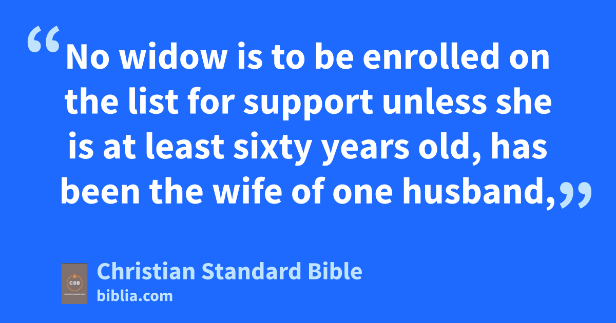 9 No widow is to be enrolled on the list for support unless she is at least sixty years old, has been the wife of one husband, 10 and is well known for good worksj—that is, if she has brought up children, shown hospitality,k washed the saints’ feet,l helped the afflicted,m and devoted herself to every good work.n 11 But refuse to enroll younger widows, for when they are drawn away from Christ by desire, they want to marryo 12 and will therefore receive condemnationp because they have renounced their original pledge. 13 At the same time, they also learn to be idle, going from house to house; they are not only idle, but are also gossipsq and busybodies, saying things they shouldn’t say. 14 Therefore, I want younger women to marry,r have children, manage their households, and give the adversary no opportunity to accuse us.s 15 For some have already turned awayt to follow Satan. 16 If anyA believing woman has widows in her family, let her help them. Let the church not be burdened, so that it can help widows in genuine need.