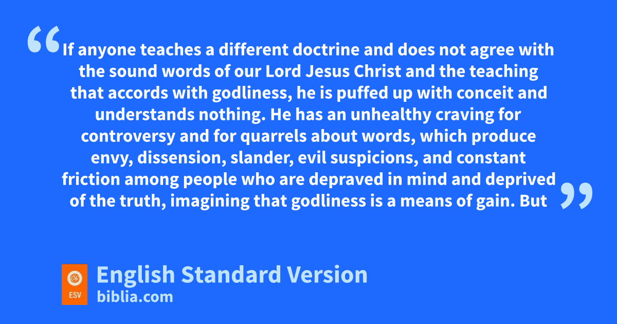 rTeach and urge these things. 3 If anyone steaches a different doctrine and does not agree with tthe sound2 words of our Lord Jesus Christ and the teaching uthat accords with godliness, 4 vhe is puffed up with conceit and wunderstands nothing. He has an unhealthy craving for xcontroversy and for yquarrels about words, which produce envy, dissension, slander, evil suspicions, 5 and constant friction among people zwho are depraved in mind and deprived of the truth, aimagining that godliness is a means of gain. 6 But bgodliness cwith contentment is great gain, 7 for dwe brought nothing into the world, and3 we cannot take anything out of the world. 8 But eif we have food and clothing, with these we will be content. 9 But fthose who desire to be rich fall into temptation, ginto a snare, into many senseless and harmful desires that hplunge people into ruin and destruction. 10 For the love of money is a root of iall kinds of evils. It is through this craving that some have wandered away from the faith and pierced themselves with many pangs.