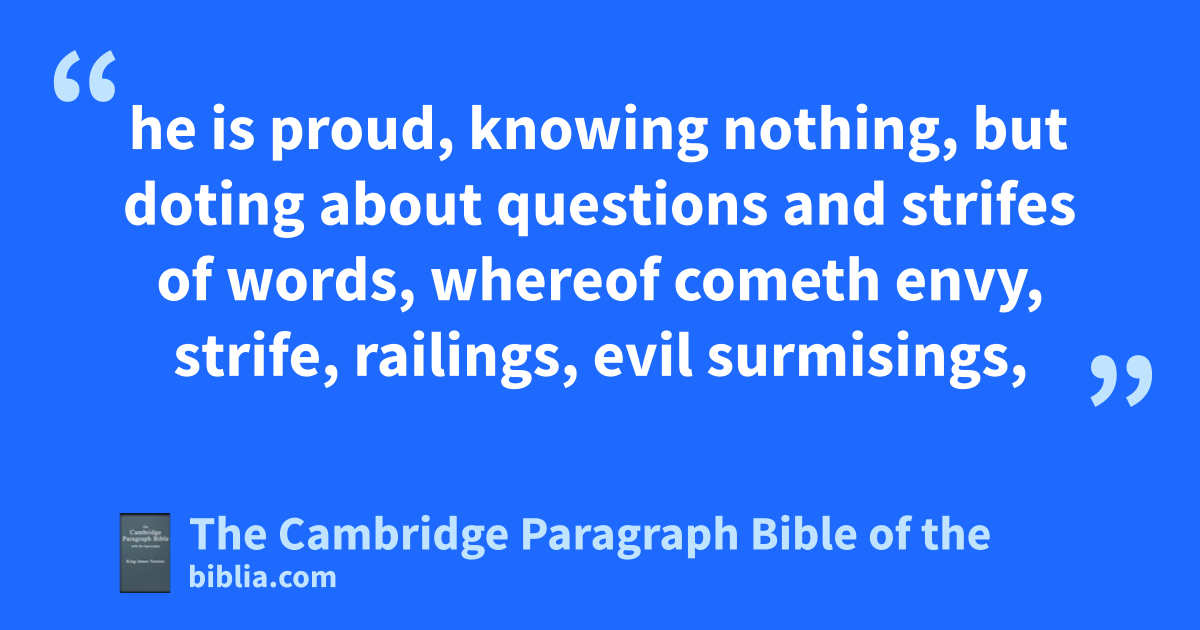 VI. Let as many aservants as are under the yoke count their own masters worthy of all honour, that bthe name of God and chis ddoctrine be not eblasphemed. 2 And they that have believing masters, let them not despise them, because they are fbrethren; but rather do them service, because they are * faithful and beloved, partakers of the benefit. gThese things teach and exhort. 3 If any man hteach otherwise, and consent not to iwholesome words, even the words of our Lord Jesus Christ, and to the doctrine kwhich is according to godliness; 4 he lis * proud, mknowing nothing, but * doting about nquestions and nnstrifes of words, whereof cometh oenvy, ostrife, prailings, evil surmisings, 5 * qperverse disputings of rmen of corrupt minds, and destitute of the truth, ssupposing that gain is godliness: tfrom such withdraw thyself. 6 But ugodliness vwith contentment wis great gain. 7 For xwe brought nothing into this world, and it is certain we can carry nothing out. 8 And yhaving food and raiment let us be therewith vcontent. 9 But zthey that will be rich fall into temptation and aa snare, and into many foolish and hurtful lusts, bwhich drown men in destruction and perdition. 10 For cthe love of money is the root of all evil: which while some coveted after, they have * erred from the faith, and pierced themselves through with many sorrows. 11 But thou, dO man of God, eflee these things; and effollow after righteousness, ggodliness, hfaith, hlove, patience, hhmeekness. 12 ijFight the good kfight of faith, llay hold on eternal life, whereunto llthou art also called, and hast professed a good profession before many witnesses. 13 mI give thee charge nin the sight of God, owho quickeneth all things, and before Christ Jesus, pwho before Pontius Pilate witnessed a good * confession; 14 that thou qkeep this commandment without spot, runrebukeable, suntil tthe appearing of our Lord Jesus Christ: 15 which uin his times he shall shew, who is vthe blessed and only wPotentate, xyzthe King of kings, and yLord of lords; 16 zwho only hath immortality, zadwelling in the light which no man can approach unto; bwhom no man hath seen, nor can see: to whom be cdhonour and epower everlasting. Amen.
