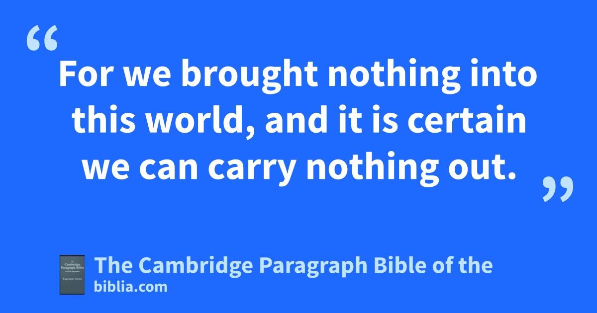 VI. Let as many aservants as are under the yoke count their own masters worthy of all honour, that bthe name of God and chis ddoctrine be not eblasphemed. 2 And they that have believing masters, let them not despise them, because they are fbrethren; but rather do them service, because they are * faithful and beloved, partakers of the benefit. gThese things teach and exhort. 3 If any man hteach otherwise, and consent not to iwholesome words, even the words of our Lord Jesus Christ, and to the doctrine kwhich is according to godliness; 4 he lis * proud, mknowing nothing, but * doting about nquestions and nnstrifes of words, whereof cometh oenvy, ostrife, prailings, evil surmisings, 5 * qperverse disputings of rmen of corrupt minds, and destitute of the truth, ssupposing that gain is godliness: tfrom such withdraw thyself. 6 But ugodliness vwith contentment wis great gain. 7 For xwe brought nothing into this world, and it is certain we can carry nothing out. 8 And yhaving food and raiment let us be therewith vcontent. 9 But zthey that will be rich fall into temptation and aa snare, and into many foolish and hurtful lusts, bwhich drown men in destruction and perdition. 10 For cthe love of money is the root of all evil: which while some coveted after, they have * erred from the faith, and pierced themselves through with many sorrows. 11 But thou, dO man of God, eflee these things; and effollow after righteousness, ggodliness, hfaith, hlove, patience, hhmeekness. 12 ijFight the good kfight of faith, llay hold on eternal life, whereunto llthou art also called, and hast professed a good profession before many witnesses. 13 mI give thee charge nin the sight of God, owho quickeneth all things, and before Christ Jesus, pwho before Pontius Pilate witnessed a good * confession; 14 that thou qkeep this commandment without spot, runrebukeable, suntil tthe appearing of our Lord Jesus Christ: 15 which uin his times he shall shew, who is vthe blessed and only wPotentate, xyzthe King of kings, and yLord of lords; 16 zwho only hath immortality, zadwelling in the light which no man can approach unto; bwhom no man hath seen, nor can see: to whom be cdhonour and epower everlasting. Amen.
