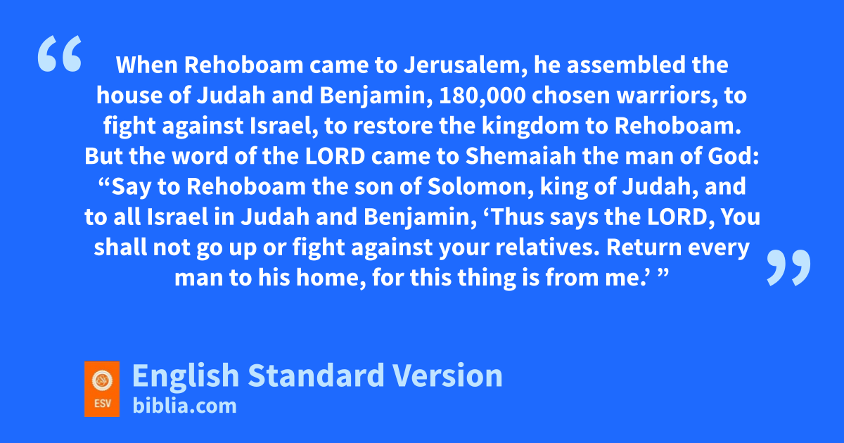 11 kWhen Rehoboam came to Jerusalem, he assembled the house of Judah and Benjamin, 180,000 chosen warriors, to fight against Israel, to restore the kingdom to Rehoboam. 2 But the word of the Lord came to lShemaiah the man of God: 3 “Say to Rehoboam the son of Solomon, king of Judah, and to all Israel in Judah and Benjamin, 4 ‘Thus says the Lord, You shall not go up or fight against myour relatives. Return every man to his home, for this thing is from me.’ ” So they listened to the word of the Lord and returned and did not go against Jeroboam.