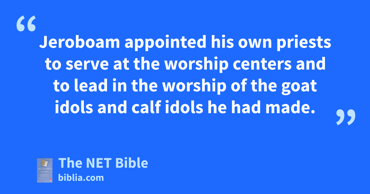 11:13 The priests and Levites who lived throughout Israel supported him, no matter where they resided.8 11:14 The Levites even left their pasturelands and their property behind and came to Judah and Jerusalem, for Jeroboam and his sons prohibited them from serving as the Lord’s priests. 11:15 Jeroboam9 appointed his own priests to serve at the worship centers10 and to lead in the worship of the goat idols and calf idols he had made.11 11:16 Those among all the Israelite tribes who were determined to worship the Lord God of Israel followed them to Jerusalem12 to sacrifice to the Lord God of their ancestors.13 11:17 They supported14 the kingdom of Judah and were loyal to15 Rehoboam son of Solomon for three years; they followed the edicts of16 David and Solomon for three years.
