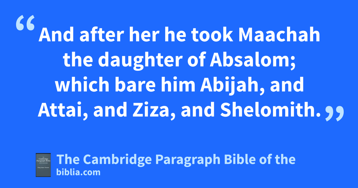 18 And Rehoboam took him Mahalath the daughter of Jerimoth the son of David to wife, and Abihail the daughter of bEliab the son of Jesse; 19 which bare him children; Jeush, and Shamariah, and Zaham. 20 And after her he took cMaachah the daughter of dAbsalom; which bare him eAbijah, and Attai, and Ziza, and Shelomith. 21 And Rehoboam loved Maachah the daughter of Absalom above all his wives and his concubines: (for he took eighteen wives, and threescore concubines; and begat twenty and eight sons, and threescore daughters.) 22 And fRehoboam made eAbijah the son of Maachah the chief, to be ruler among his brethren: for he thought to make him king. 23 And he dealt wisely, and dispersed of all his children throughout all the countries of Judah and Benjamin, unto every fenced city: and he gave them gvictual in abundance. And he hdesired * many wives.