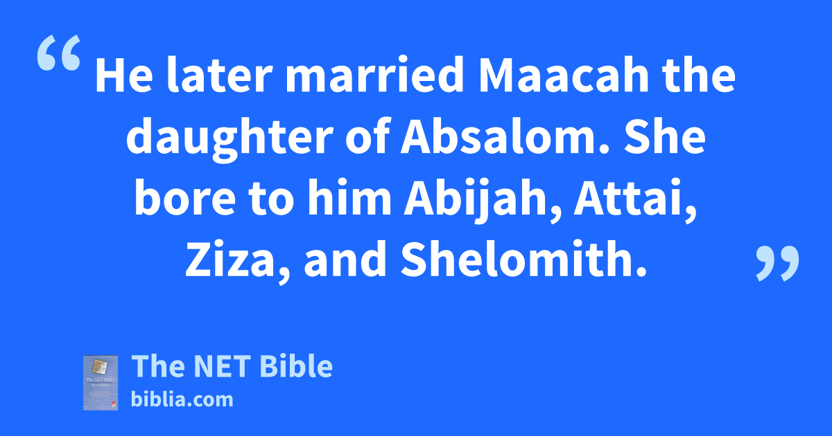 11:18 Rehoboam married17 Mahalath the daughter of David’s son Jerimoth and of18 Abihail, the daughter of Jesse’s son Eliab. 11:19 She bore him sons named Jeush, Shemariah, and Zaham. 11:20 He later married Maacah the daughter of Absalom. She bore to him Abijah, Attai, Ziza, and Shelomith. 11:21 Rehoboam loved Maacah daughter of Absalom more than his other wives and concubines.19 He had eighteen wives and sixty concubines; he fathered twenty-eight sons and sixty daughters.
