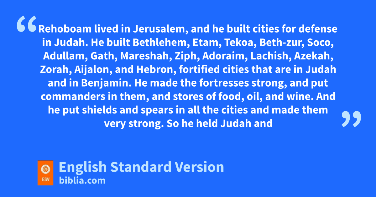 5 Rehoboam lived in Jerusalem, and he built ncities for defense in Judah. 6 He built Bethlehem, Etam, Tekoa, 7 Beth-zur, Soco, Adullam, 8 Gath, oMareshah, Ziph, 9 Adoraim, Lachish, Azekah, 10 Zorah, Aijalon, and Hebron, fortified cities that are in Judah and in Benjamin. 11 He made the fortresses strong, and put commanders in them, and stores of food, oil, and wine. 12 And he put shields and spears in all the cities and made them very strong. So he held Judah and Benjamin.