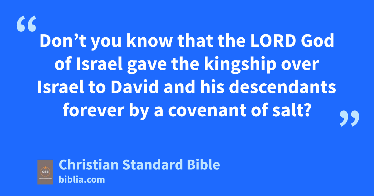 There was war between Abijah and Jeroboam. 3 Abijah set his army of warriors in order with four hundred thousand fit young men. Jeroboam arranged his mighty army of eight hundred thousand fit young men in battle formation against him. 4 Then Abijah stood on Mount Zemaraim,x which is in the hill country of Ephraim, and said, “Jeroboam and all Israel, hear me. 5 Don’t you know that the Lord God of Israel gave the kingship over Israel to David and his descendants forevery by a covenant of salt?z 6 But Jeroboam son of Nebat, a servant of Solomon son of David, rose up and rebelled against his lord.aa 7 Then worthless and wicked men gathered around him to resist Rehoboam son of Solomon when Rehoboam was young, inexperienced, and unable to assert himself against them.