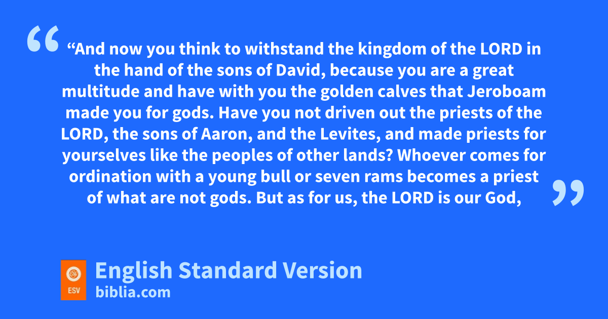 8 “And now you think to withstand the kingdom of the Lord in the hand of the sons of David, because you are a great multitude and have with you kthe golden calves that Jeroboam made you for gods. 9 lHave you not driven out the priests of the Lord, the sons of Aaron, and the Levites, and made priests for yourselves like the peoples of other lands? Whoever comes mfor ordination4 with a young bull or seven rams becomes a priest of what are nnot gods. 10 But as for us, the Lord is our God, and we have not forsaken him. We have priests ministering to the Lord who are sons of Aaron, and Levites for their service. 11 They offer to the Lord oevery morning and every evening burnt offerings and incense of sweet spices, set out pthe showbread on the table of pure gold, qand care for the golden lampstand that its lamps may rburn every evening. For we skeep the charge of the Lord our God, but you have forsaken him. 12 Behold, God is with us at our head, and his priests twith their battle trumpets to sound the call to battle against you. O sons of Israel, udo not fight against the Lord, the God of your fathers, for you cannot succeed.”