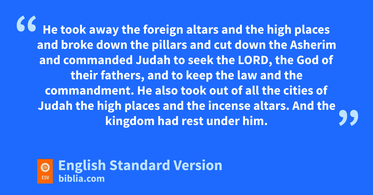 14 1 gAbijah slept with his fathers, and they buried him in the city of David. And Asa his son reigned in his place. In his days the land had rest for ten years. 2 2 And Asa did what was good and right in the eyes of the Lord his God. 3 He took away the foreign altars hand the high places and broke down ithe pillars and cut down the jAsherim 4 and commanded Judah to seek the Lord, the God of their fathers, and to keep the law and the commandment. 5 He also took out of all the cities of Judah hthe high places and the kincense altars. And the kingdom had rest under him. 6 He built lfortified cities in Judah, for the land had rest. He had no war in those years, mfor the Lord gave him peace. 7 And he said to Judah, “Let us build these cities and surround them with nwalls and towers, gates and bars. The land is still ours, because we have sought the Lord our God. We have sought him, mand he has given us peace on every side.” So they built and prospered. 8 And Asa had an army of o300,000 from Judah, armed with large shields and spears, and 280,000 men from Benjamin that carried shields and drew bows. All these were mighty men of valor.