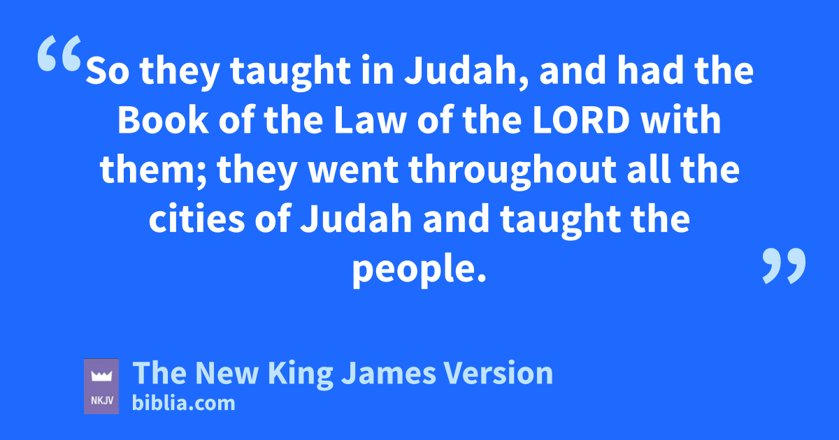 7 Also in the third year of his reign he sent his leaders, Ben-Hail, Obadiah, Zechariah, Nethanel, and Michaiah, hto teach in the cities of Judah. 8 And with them he sent Levites: Shemaiah, Nethaniah, Zebadiah, Asahel, Shemiramoth, Jehonathan, Adonijah, Tobijah, and Tobadonijah—the Levites; and with them Elishama and Jehoram, the priests. 9 iSo they taught in Judah, and had the Book of the Law of the Lord with them; they went throughout all the cities of Judah and taught the people.