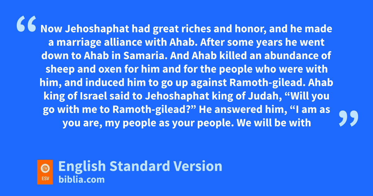 18 Now Jehoshaphat ahad great riches and honor, band he made a marriage alliance with Ahab. 2 cAfter some years he went down to Ahab in Samaria. And Ahab killed an abundance of sheep and oxen for him and for the people who were with him, and induced him to go up against Ramoth-gilead. 3 Ahab king of Israel said to Jehoshaphat king of Judah, “Will you go with me to Ramoth-gilead?” He answered him, “I am as you are, my people as your people. We will be with you in the war.”