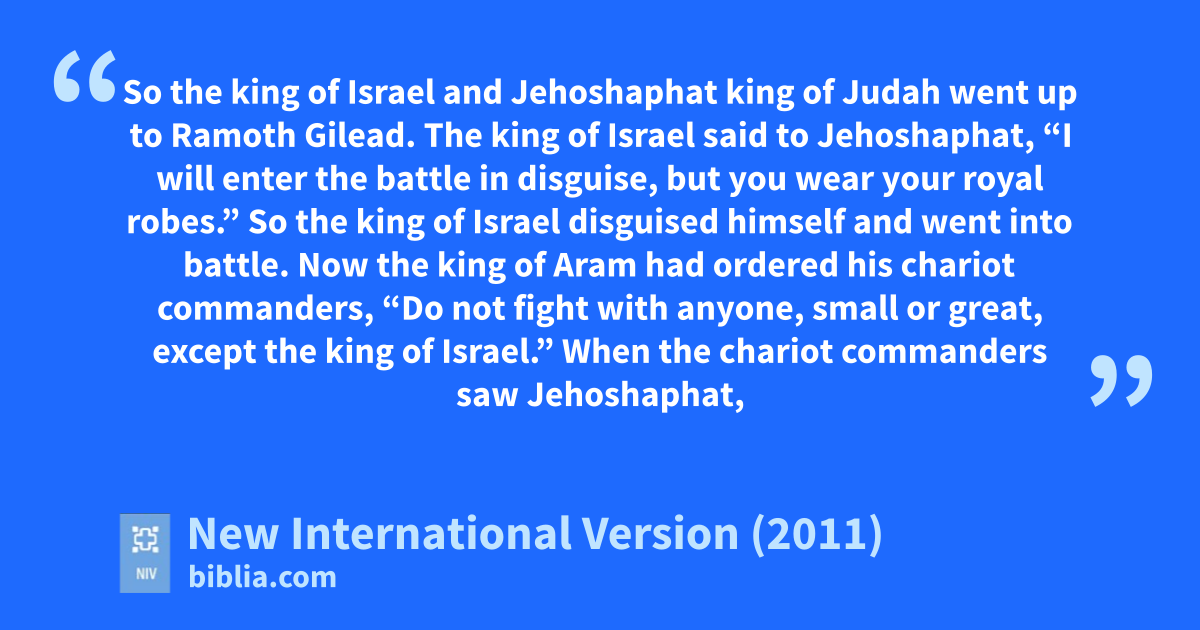 28 So the king of Israel and Jehoshaphat king of Judah went up to Ramoth Gilead. 29 The king of Israel said to Jehoshaphat, “I will enter the battle in disguise, but you wear your royal robes.” So the king of Israel disguisedg himself and went into battle.