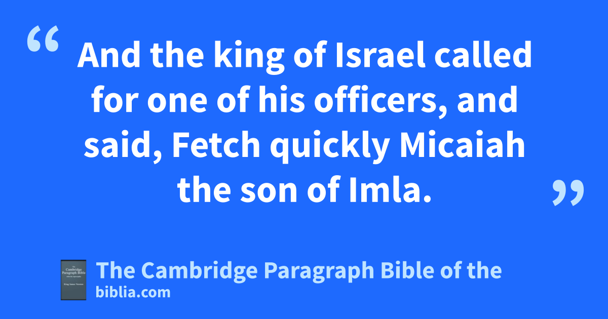 XVIII. * Now Jehoshaphat ahad riches and honour in abundance, and bjoined affinity with Ahab. 2 And * after certain years che went down to Ahab to dSamaria. And Ahab killed sheep and oxen for him in abundance, and for the people that he had with him, and epersuaded him to go up with him to fRamoth-gilead. 3 And Ahab king of Israel said unto Jehoshaphat king of Judah, Wilt thou go with me to Ramoth-gilead? And he answered him, I am as thou art, and my people as thy people; and we will be with thee in the war. 4 And Jehoshaphat said unto the king of Israel, Inquire, I pray thee, at the word of the Lord to day. 5 Therefore the king of Israel gathered together of prophets four hundred men, and said unto them, Shall we go to Ramoth-gilead to battle, or shall I forbear? And they said, Go up; for God will deliver it into the king’s hand. 6 But Jehoshaphat said, Is there not here a prophet of the Lord * besides, that we might inquire of him? 7 And the king of Israel said unto Jehoshaphat, There is yet one man, by whom we may inquire of the Lord: but I hate him; for he never prophesied good unto me, but always evil: the same is Micaiah the son of Imla. And Jehoshaphat said, Let not the king say so. 8 And the king of Israel called for one of his * officers, and said, * Fetch quickly Micaiah the son of Imla. 9 And the king of Israel and Jehoshaphat king of Judah sat either of them on his throne, clothed in their robes, and they sat in a * void place at the entering in of the gate of Samaria; and all the prophets prophesied before them. 10 And Zedekiah the son of Chenaanah had made him horns of iron, and said, Thus saith the Lord, With these thou shalt push Syria until * they be consumed. 11 And all the prophets prophesied so, saying, Go up to Ramoth-gilead, and prosper: for the Lord shall deliver it into the hand of the king.