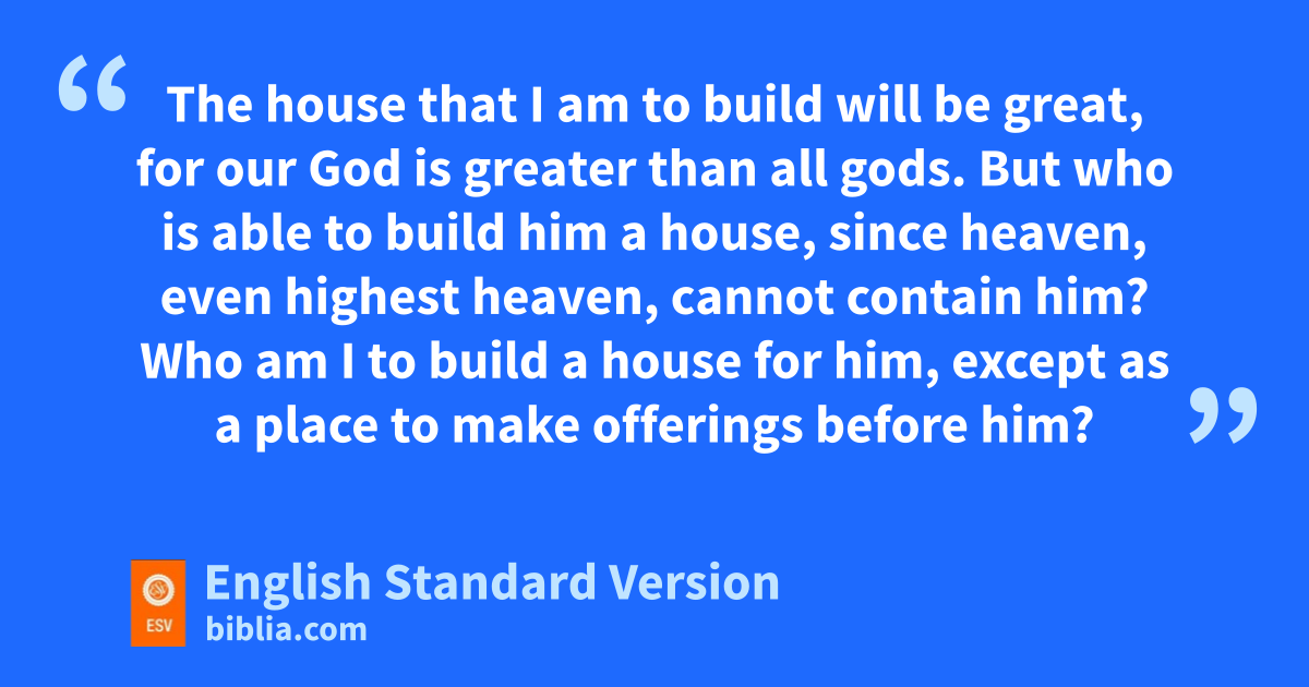 2 1 xNow Solomon purposed to build a temple for the name of the Lord, and a royal palace for himself. 2 2 yAnd Solomon assigned 70,000 men to bear burdens and 80,000 to quarry in the hill country, and z3,600 to oversee them. 3 aAnd Solomon sent word to Hiram the king of Tyre: b“As you dealt with David my father and sent him cedar to build himself a house to dwell in, so deal with me. 4 Behold, I am about to build a house for the name of the Lord my God and dedicate it to him for the burning of cincense of sweet spices before him, and for dthe regular arrangement of the showbread, and for eburnt offerings morning and evening, fon the Sabbaths and the new moons and the appointed feasts of the Lord our God, as ordained forever for Israel. 5 The house that I am to build will be great, gfor our God is greater than all gods. 6 hBut who is able to build him a house, since hheaven, even highest heaven, cannot contain him? Who am I to build a house for him, except as a place to make offerings before him? 7 So now isend me a man skilled to work in gold, silver, bronze, and iron, and in purple, crimson, and blue fabrics, trained also in engraving, to be with the skilled workers who are with me in Judah and Jerusalem, jwhom David my father provided. 8 Send me also cedar, cypress, and algum timber from Lebanon, for I know that kyour servants know how to cut timber in Lebanon. And my servants will be with your servants, 9 to prepare timber for me in abundance, for the house I am to build will be great and wonderful. 10 lI will give for your servants, the woodsmen who cut timber, 20,000 cors3 of crushed wheat, 20,000 cors of barley, 20,000 baths4 of wine, and 20,000 baths of oil.”