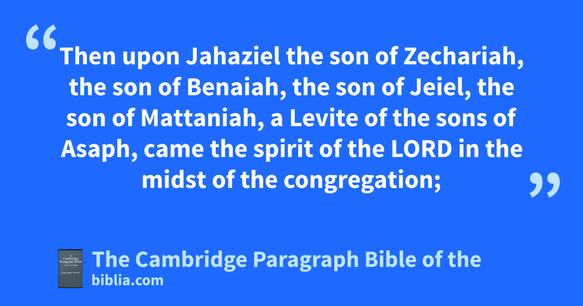 14 Then upon Jahaziel the son of Zechariah, the son of Benaiah, the son of Jeiel, the son of Mattaniah, a Levite of the sons of zAsaph, acame the spirit of the Lord in the midst of the congregation; 15 and he said, Hearken ye, all Judah, and ye inhabitants of Jerusalem, and thou king Jehoshaphat, Thus saith the Lord unto you, bBe not afraid nor dismayed by reason of this great multitude; for cthe battle is not yours, but God’s. 16 To morrow go ye down against them: behold, they come up by the * cliff of Ziz; and ye shall find them at the end of the * brook, before the wilderness of Jeruel. 17 dYe shall not need to fight in this battle: set yourselves, stand ye still, and see the salvation of the Lord with you, O Judah and Jerusalem: bfear not, nor be dismayed; to morrow go out against them: efor the Lord will be with you. 18 And Jehoshaphat fbowed his head with his face to the ground: and all Judah and the inhabitants of Jerusalem fell before the Lord, worshipping the Lord. 19 And the Levites, of the children of the gKohathites, and of the children of the hKorhites, stood up to praise the Lord God of Israel with a loud voice on high.