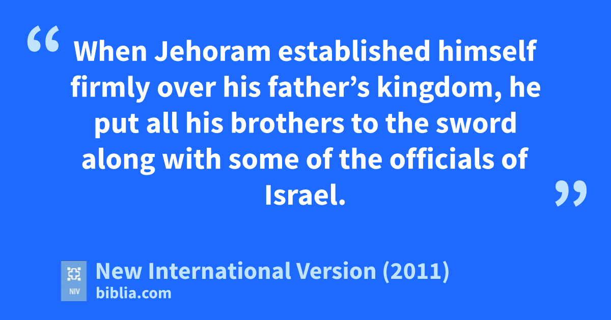 4 When Jehoram establisheds himself firmly over his father’s kingdom, he put all his brotherst to the sword along with some of the officials of Israel. 5 Jehoram was thirty-two years old when he became king, and he reigned in Jerusalem eight years. 6 He followed the ways of the kings of Israel,u as the house of Ahab had done, for he married a daughter of Ahab.v He did evil in the eyes of the Lord. 7 Nevertheless, because of the covenant the Lord had made with David,w the Lord was not willing to destroy the house of David.x He had promised to maintain a lampy for him and his descendants forever.