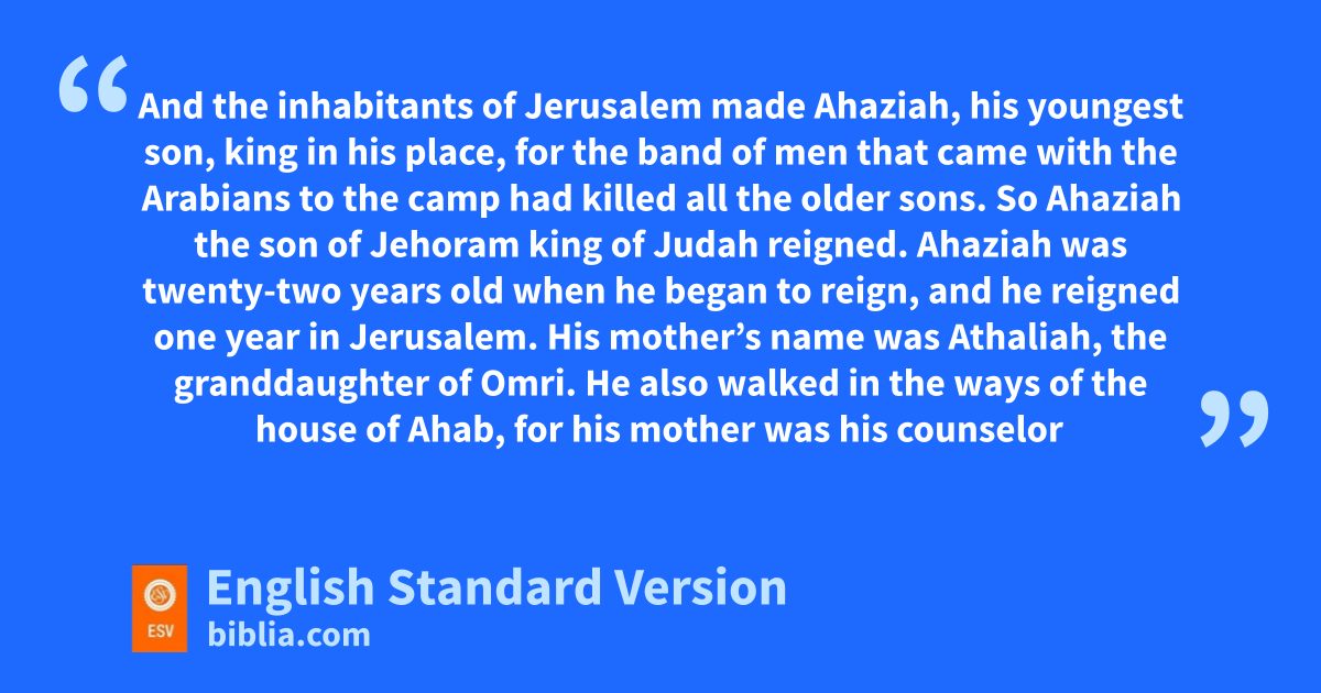 22 bAnd the inhabitants of Jerusalem made Ahaziah, his youngest son, king in his place, for the band of men that came with cthe Arabians to the camp had killed all the older sons. So Ahaziah the son of Jehoram king of Judah reigned. 2 Ahaziah was twenty-two1 years old when he began to reign, and he reigned one year in Jerusalem. His mother’s name was Athaliah, dthe granddaughter of Omri. 3 He also walked in the ways of the house of Ahab, for his mother was his counselor in doing wickedly. 4 He did what was evil in the sight of the Lord, as the house of Ahab had done. For after the death of his father they were his counselors, to his undoing. 5 He even followed their counsel and went with Jehoram the son of Ahab king of Israel to make war against Hazael king of Syria at Ramoth-gilead. And the Syrians wounded Joram, 6 and he returned to be healed in Jezreel of the wounds that he had received at Ramah, when he fought against Hazael king of Syria. And Ahaziah the son of Jehoram king of Judah went down to see Joram the son of Ahab in Jezreel, because he was wounded.
