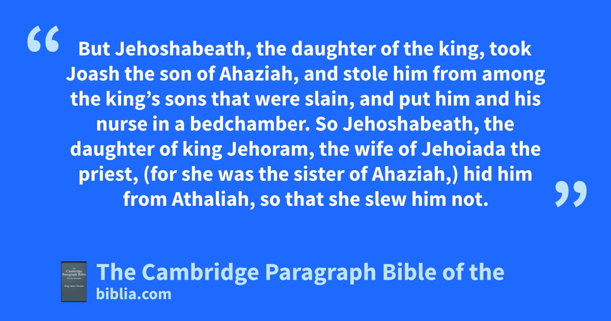 10 * rBut when Athaliah the mother of Ahaziah saw that her son was dead, she arose and destroyed all the seed royal of the house of Judah. 11 But * Jehoshabeath, the daughter of the king, took Joash the son of Ahaziah, and stole him from among the king’s sons that were slain, and put him and his nurse in a bedchamber. So Jehoshabeath, the daughter of king Jehoram, the wife of Jehoiada the priest, (for she was the sister of Ahaziah,) hid him from Athaliah, so that she slew him not. 12 And he was with them hid in the house of God six years: and Athaliah reigned over the land.